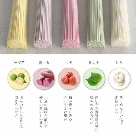紙箱入り 花モチーフ 5色入り 三輪素麺 梅(うめ)・青しそ・かぼす・ムラサキイモ 色付きソーメン
